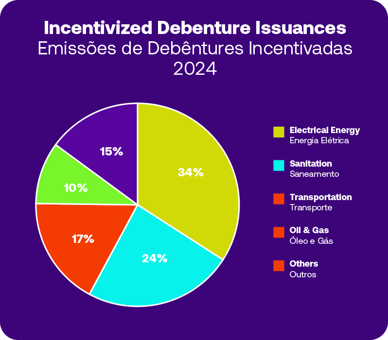 The energy sector remains Brazil’s leading issuer of Incentive Debentures (12.431) in 2024, representing approximately 34% of the total issued of this type in the year. Between January and April of this year, BRL 33.4 billion of incentivized debentures were issued, emphasizing energy (BRL 11.4 billion) and sanitation (BRL 7.9 billion).
