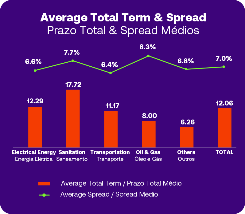 O spread médio dessas operações foi de IPCA+7,0%, 60 bps abaixo do registrado em 2023 (IPCA+7,6%), e o prazo total médio 12,06 anos.